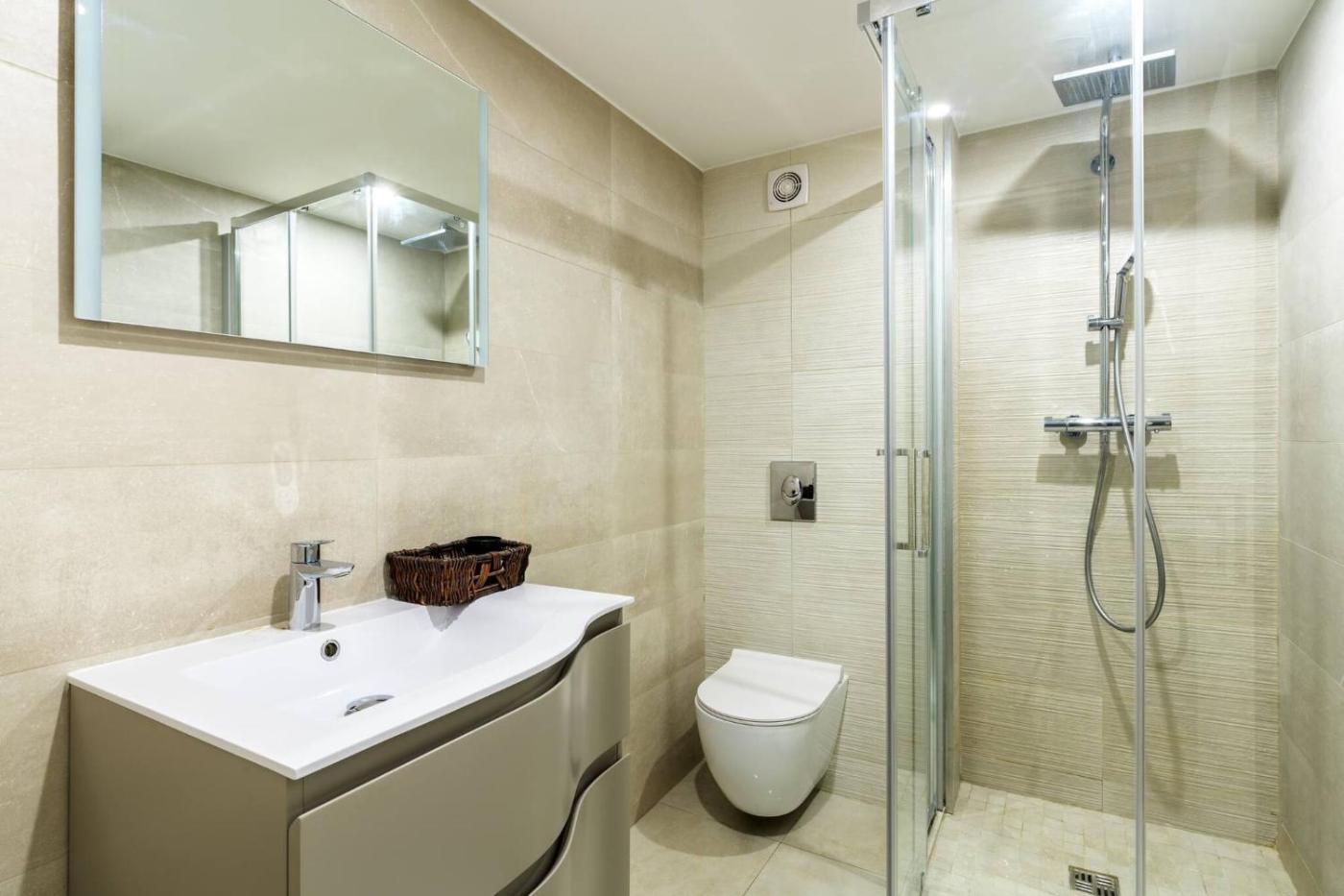 One-Bedroom Apartment. This air-conditioned apartment consists of 1 living room, 1 separate bedroom and 1 bathroom with a shower. Guests can make meals in the kitchen that is equipped with a refrigerator, kitchenware, an oven and a microwave. The apartment provides a washing machine, a tea and coffee maker, a wardrobe, heating and a TV. The unit offers 2 beds.