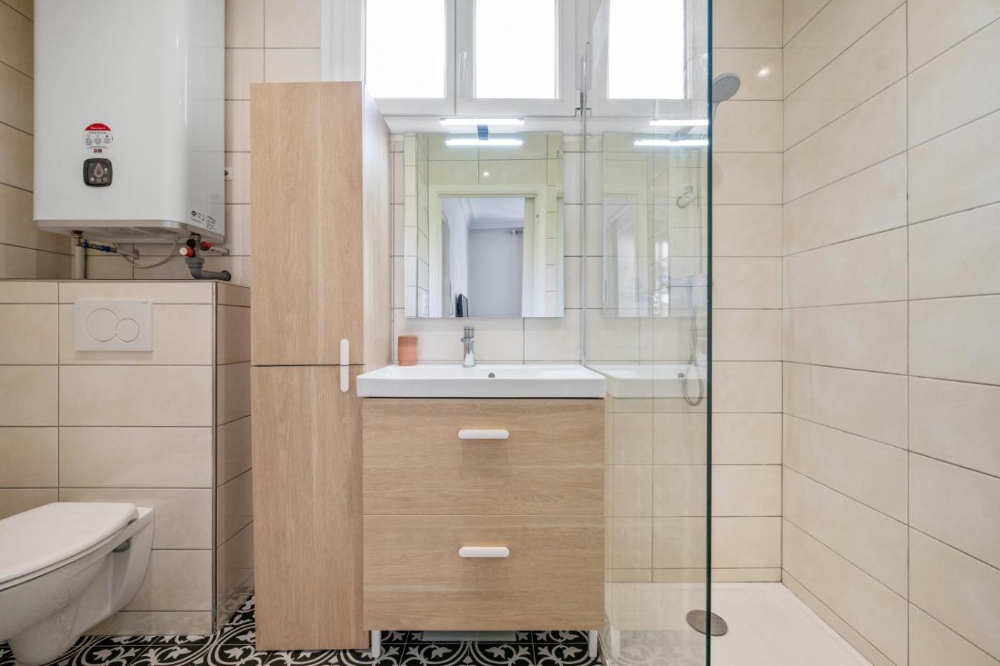 One-Bedroom Apartment. The air-conditioned apartment has 1 bedroom and 1 bathroom with a walk-in shower and a hairdryer. In the fully equipped kitchen, guests will find a stovetop, a refrigerator, a dishwasher and kitchenware. The apartment features parquet floors, a seating area with a flat-screen TV, a washing machine, a tea and coffee maker as well as garden views. The unit has 1 bed.
