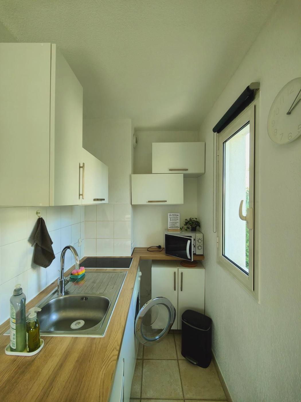 Studio Apartment. This apartment comprises 1 bedroom, a kitchen and 1 bathroom with a shower and a hairdryer. Meals can be prepared in the kitchen, which comes with a stovetop, a refrigerator and a microwave. The apartment provides a washing machine, a coffee machine, a dining area, a flat-screen TV, as well as garden views. The unit offers 1 bed.